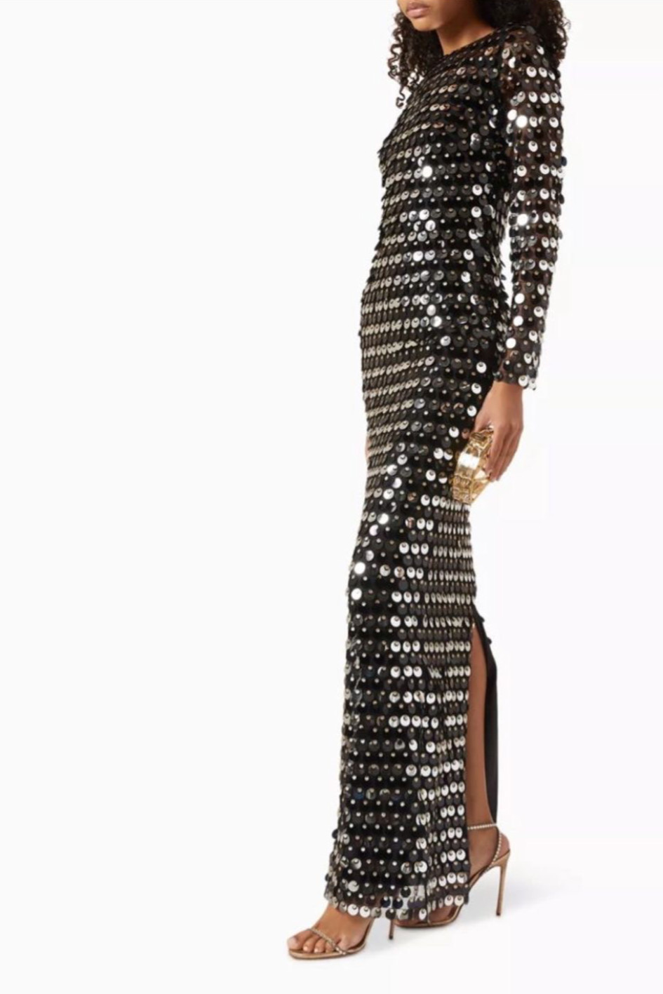 Sırt dekolteli arkadan yırtmaçlı uzun kollu payetli elbise