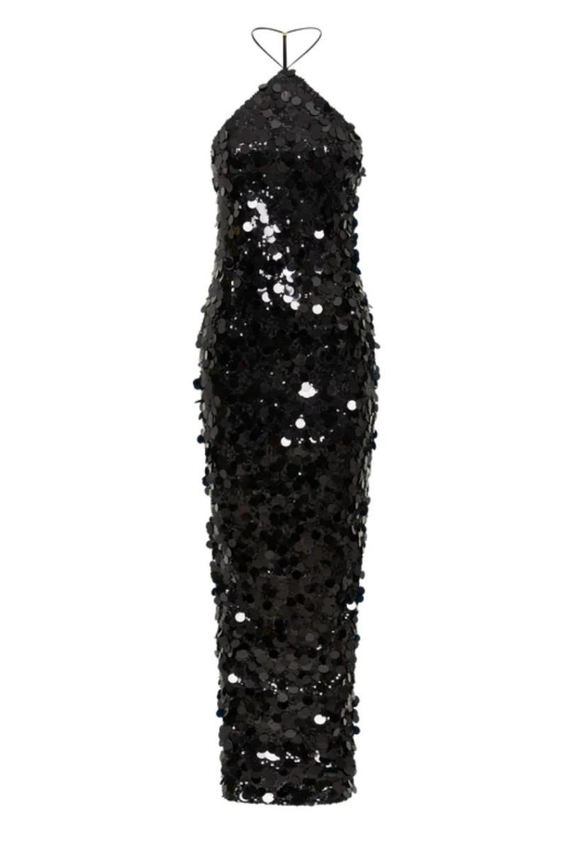 Sırt dekolteli payetli halter yakalı arkadan yırtmaçlı elbise
