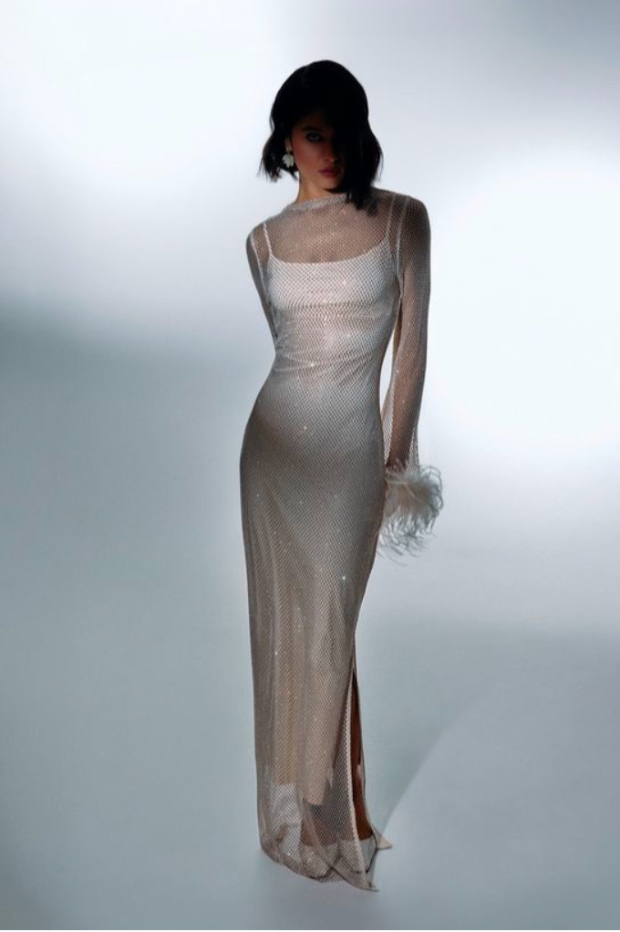 İç astarlı uzun kollu kendinden işlemeli uzun elbise