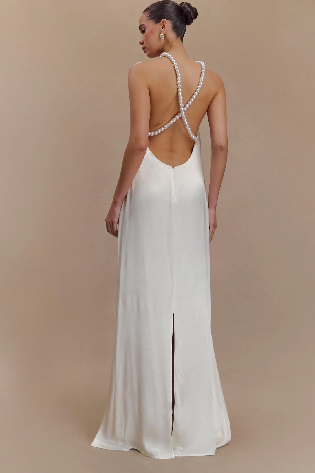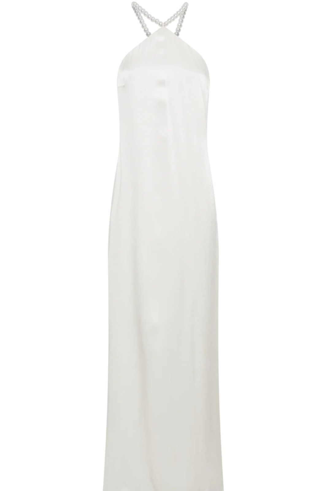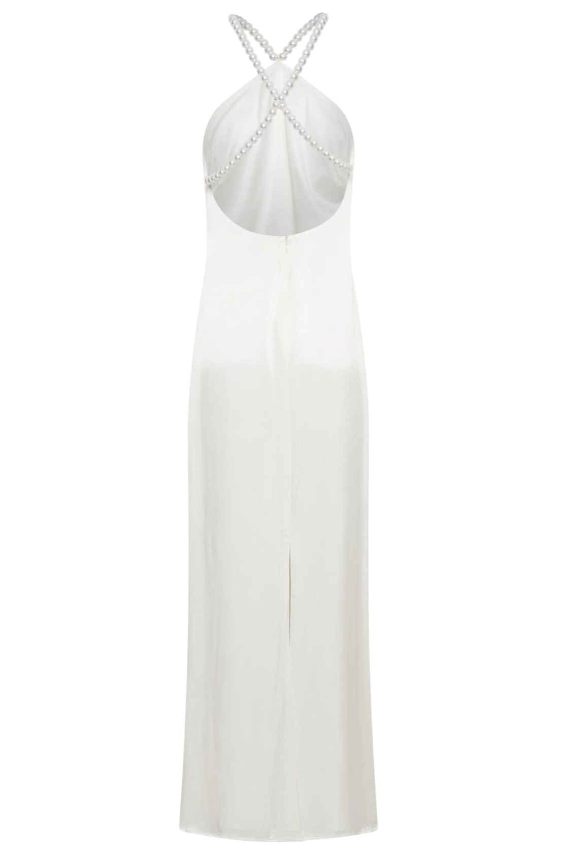 Halter yaka saten arkadan yırtmaçlı büyük inci askılı elbise