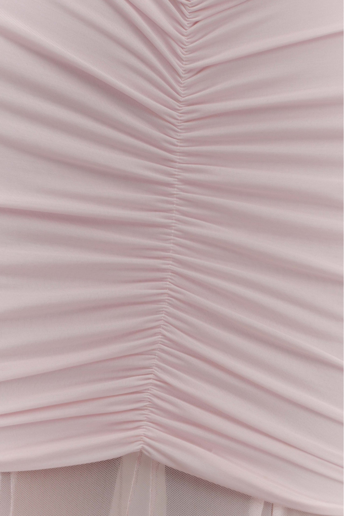 Ön ve arka beldeki drape detaylar siluetinizi güzelleştirir ve şık olduğu kadar rahat da olan hoş bir uyum sağlar. Uçuşan file etek, uhrevi bir çekicilik katarken, astarlı korse konfor ve koruma sağlar. Nişan, davet veya özel günler için mükemmel olan maksi uzunluk, elbisenin romantikliğine zarafet ve incelik katar ve onu büyülü anlarla dolu akşamlar için öne çıkan bir seçim haline getirir.